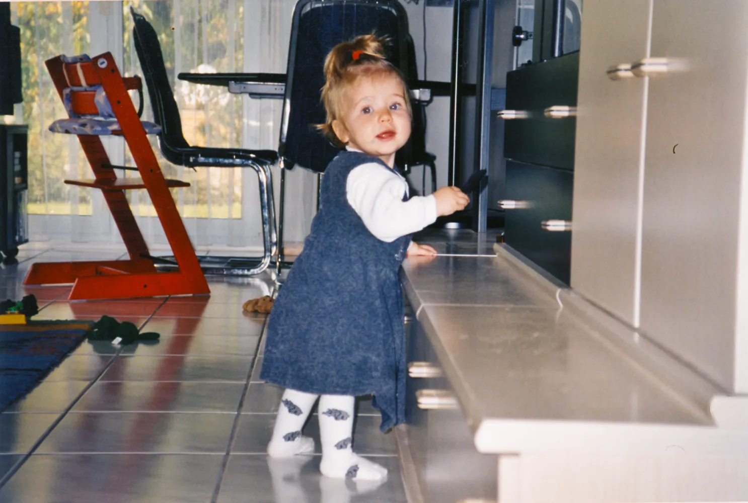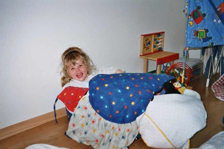 J’aime pas les pantalons et je les enlève. Maintenant, maman me met des salopettes. J’arrive pas à les enlever, ça m’énerve.